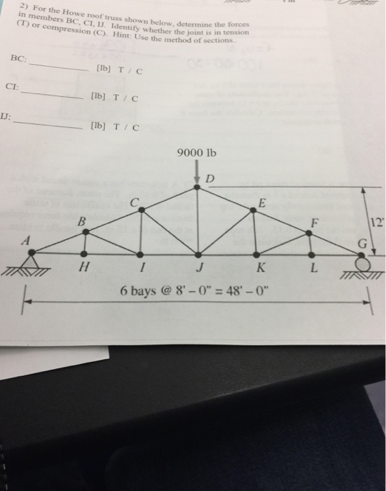 For the howe roof truss shown determine the following. For larger spans a truss with a polygonal upper cord such as the parker truss is used for some savings in material. Determine the forces in members cd ck and lk of the howe roof truss shown in fig. Problem determine the force in each member of the truss shown below method of joints. The howe roof truss shown in fig.